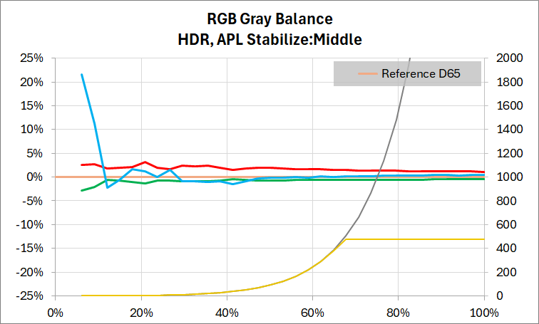 APL StabilizeをHighに切り替えると、APL 10%ではMiddleと同じく最大輝度は470cd^m2でほぼ同じですが、リファレンスが300cd^m2に達するRGBレベル 63%付近でリファレンスカーブから外れて、リファレンスが1000cd/m^2のRGBレベル 75%まで比例直線で輝度が上昇していき、その後クリップされます。