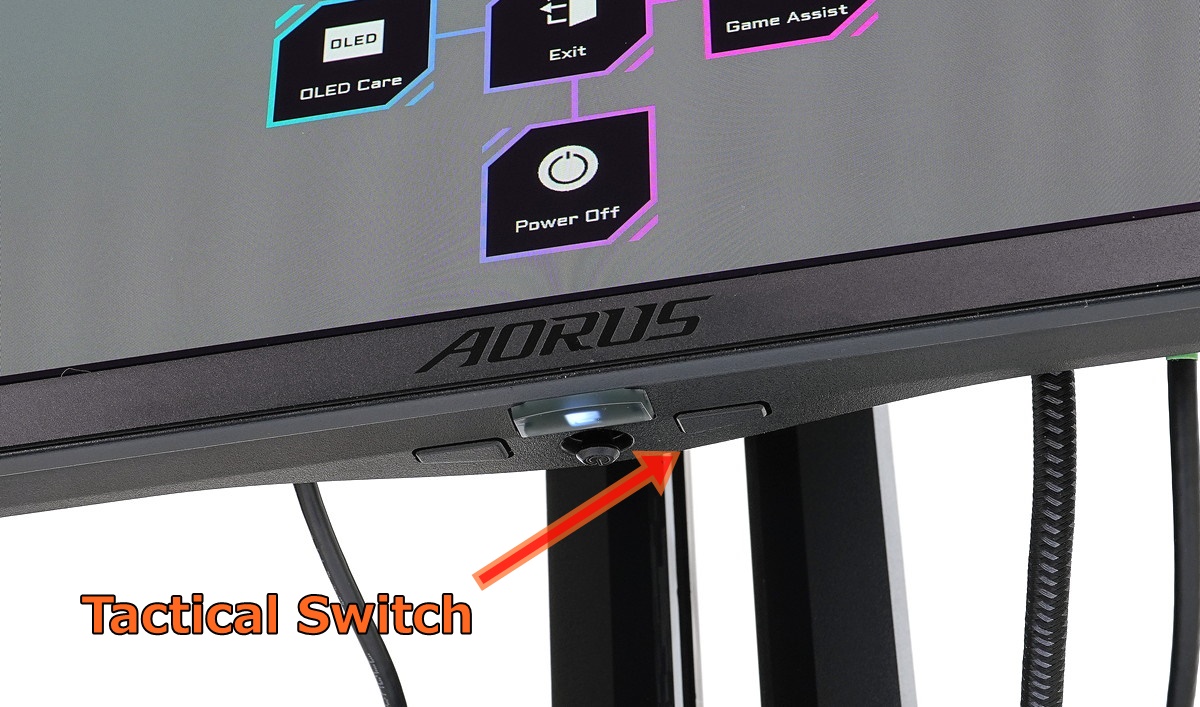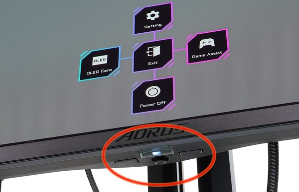 「AORUS FO32U2P」のOSD操作は底面中央に設置されている操作スティックやボタンを使用します。