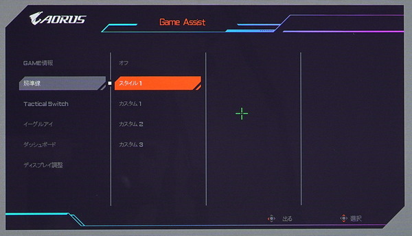 「AORUS FO32U2P」は操作スティックを押下するとメインメニューと呼ばれるランチャーが画面中央下端に表示されます。