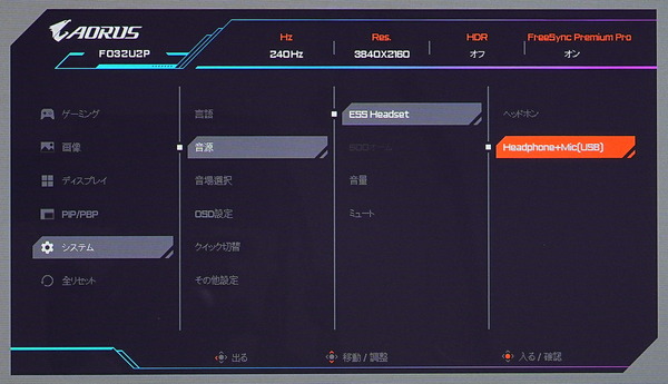 USB Type-CもしくはUSBアップストリームケーブルでPCスマホと接続している場合、「AORUS FO32U2P」の3.5mmジャックに接続されたヘッドホン・マイクをUSB接続のヘッドセットとして使用できます。