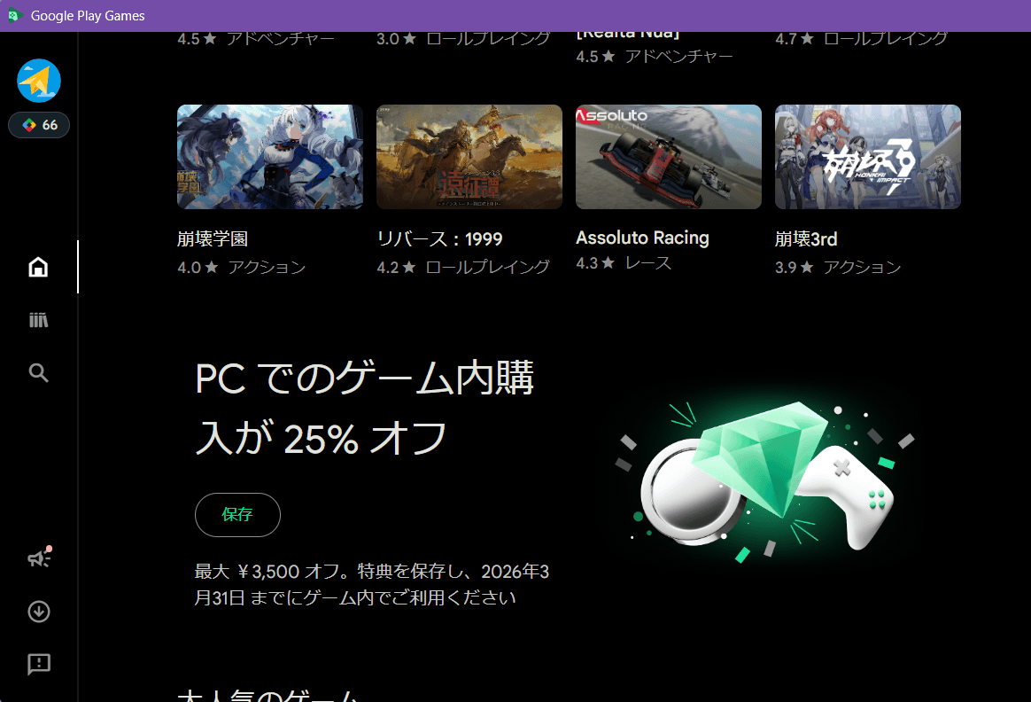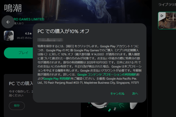 Google Play Games PC版で2025年10月13日まで購入価格そのものが10%オフになるキャンペーンが開催中です。