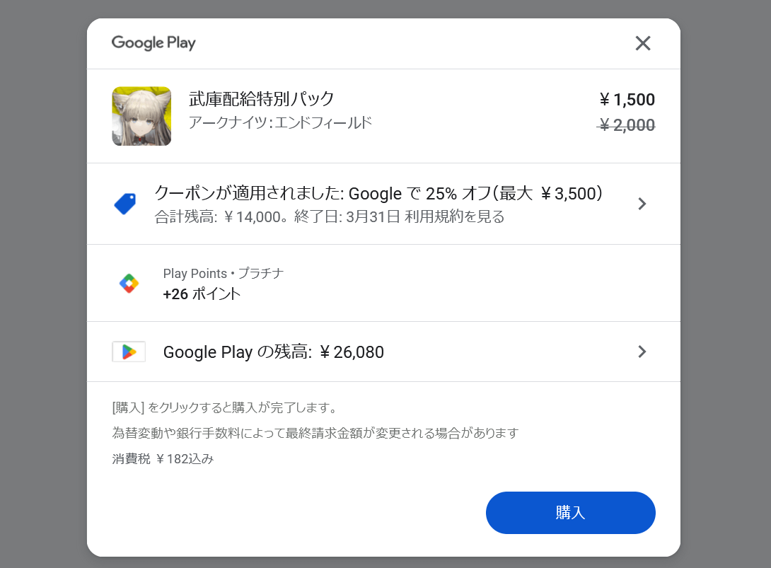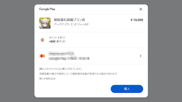 Google Play決済システムを使用した支払いでは、支払額に対して1%~2%のポイント還元が付きます。