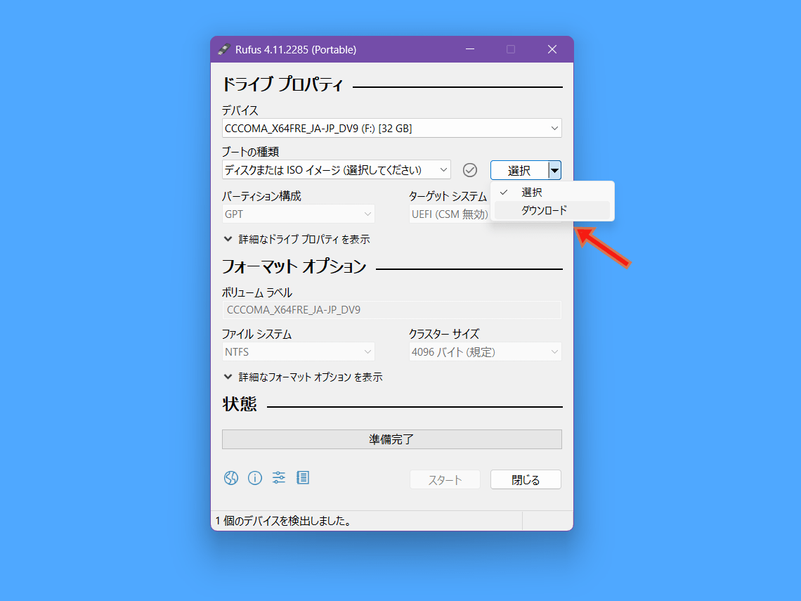 ブートの種類の右側にあるプルダウンメニューからダウンロードを選びます。