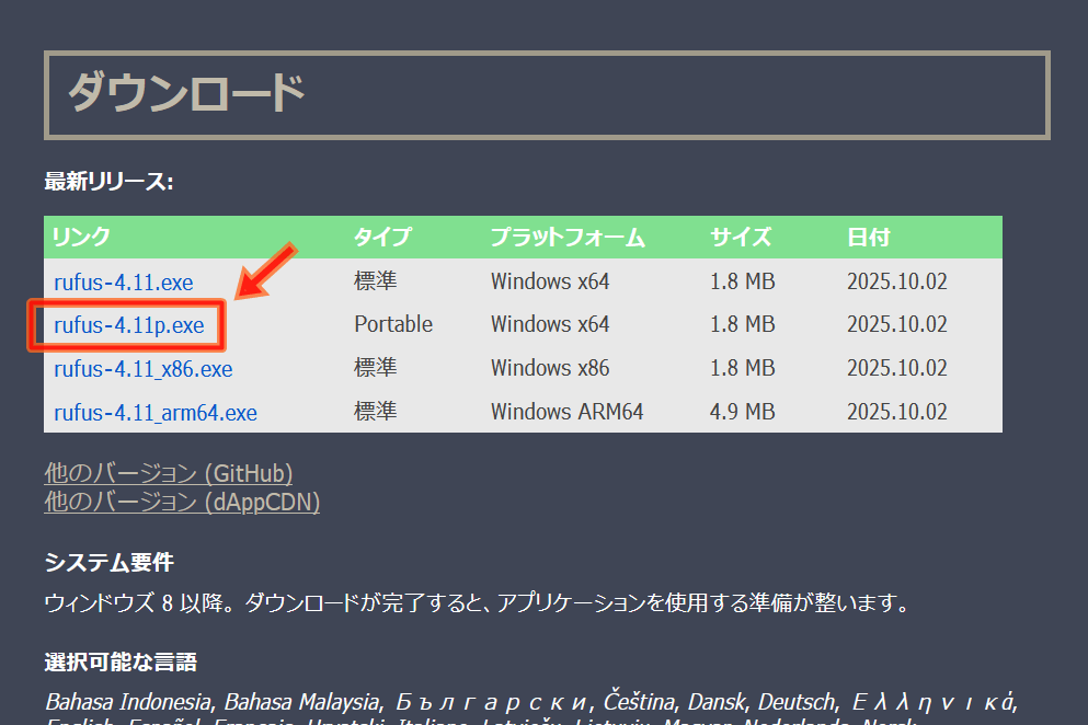 そこで今回は、RufusというOSインストールメディアを作成するフリーソフトを使用します。公式ページからダウンロードするのは、zip解凍するだけのポータブル版でOKです。