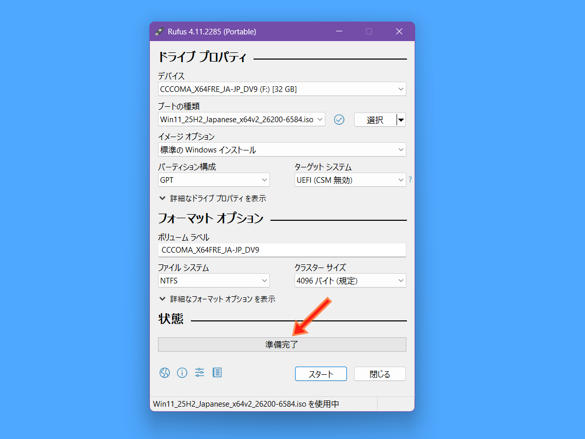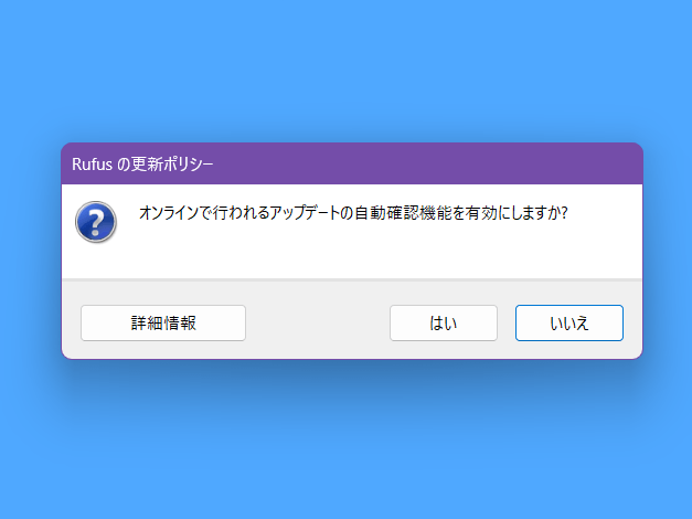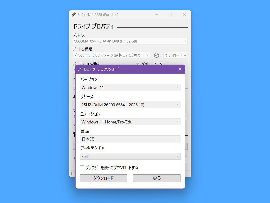 Rufus自体のサイズは1MB程度ですが、ツール実行時にWindows OSのISOファイル(5~6GB)をツール経由でダウンロードするので寝る前など時間のある時を見計らって実行しましょう。
