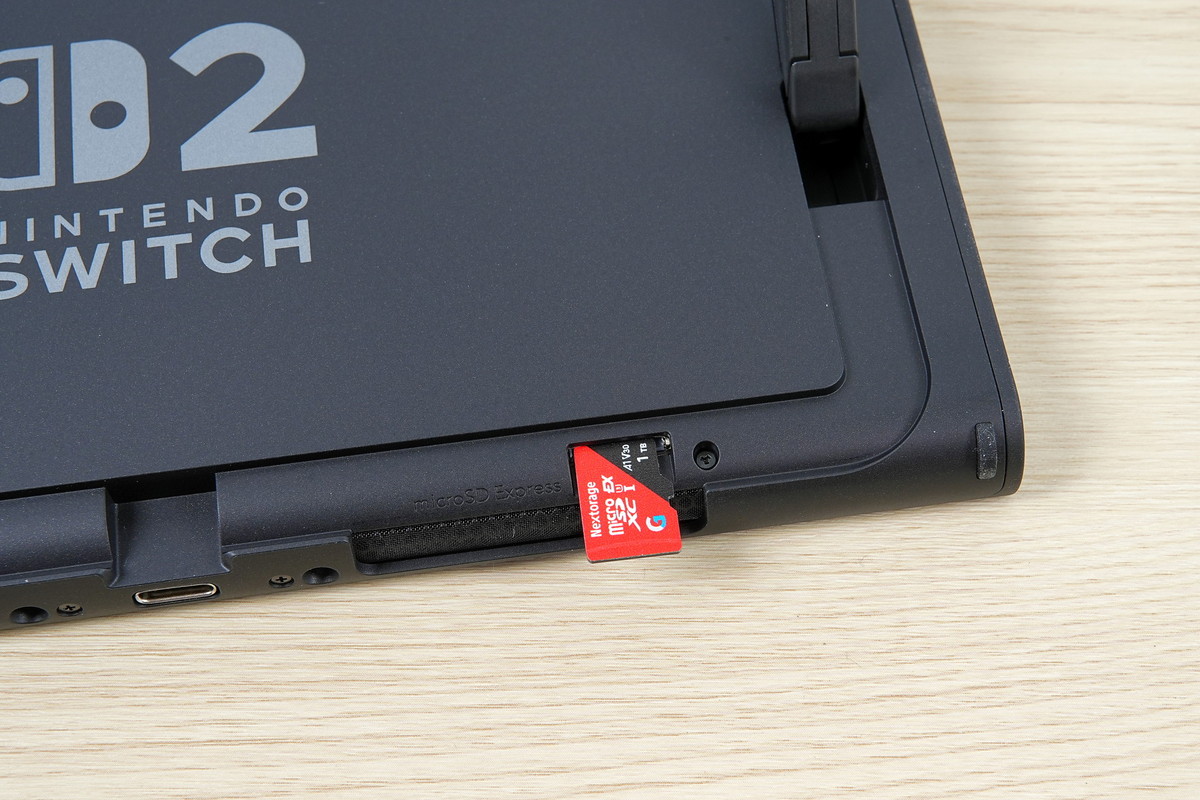 microSD Expressカードスロットは、Nintendo Switch 2のスタンドを開いて、右下辺りにあります。