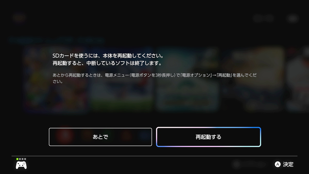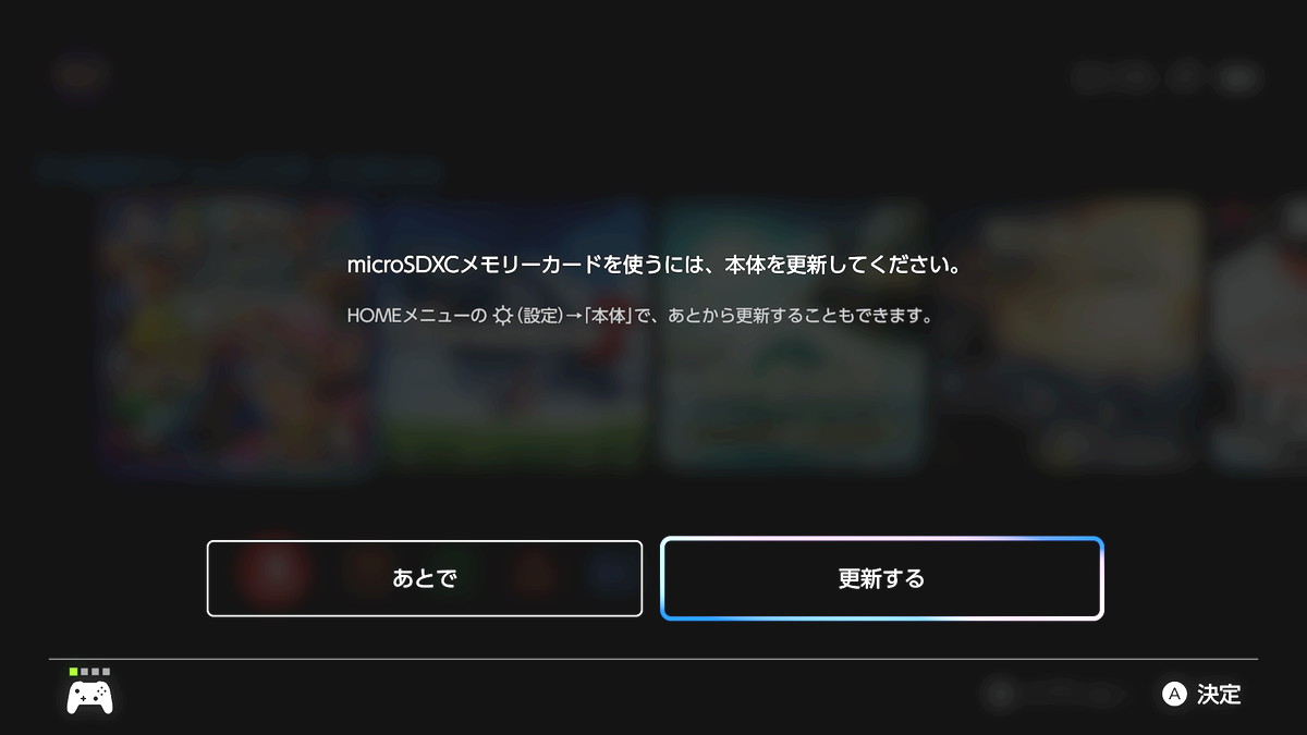 通常はmicroSD Expressカードを増設して直後の初回起動時にファームウェアアップデートのガイダンスが表示されますが、誤って『あとで』を選択するとmicroSD Expressカードが正常に検出されません。
