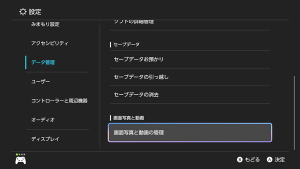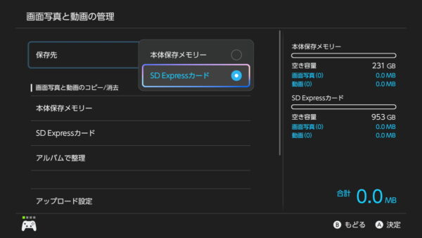 設定で「データ管理」、「画面写真と動画の管理」の順番に開くと、保存先の設定項目があり、キャプチャーボタンで撮影した画像や動画を直接保存する場所を、本体保存メモリーかSD Expressカードのどちらにするか選択できます。