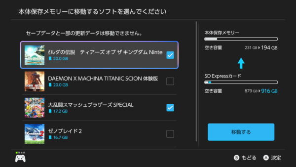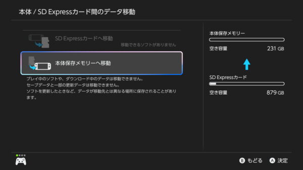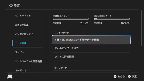 ダウンロードしたゲームはSD Expressカードへ優先的に保存されますが、ダウンロード完了後は「本体 / SD Expressカード間のデータ移動」の機能を使用すれば、任意に保存先を移動できます。