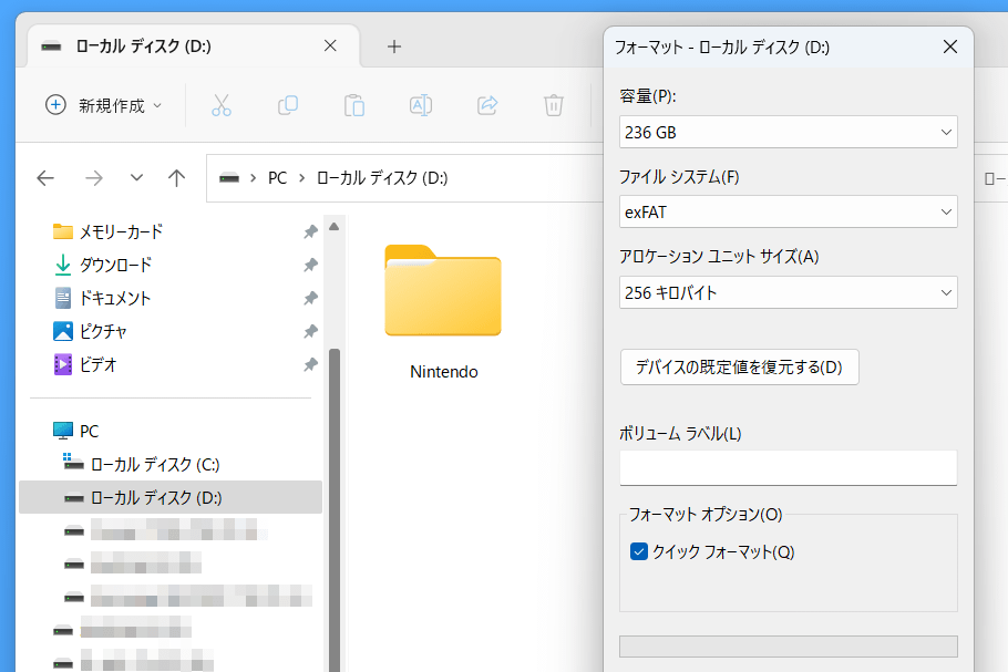 なおSD ExpressメモリーカードはexFAT形式にしてあれば、Windows PCでフォーマットしてもSwitch 2で問題なく使用できます。