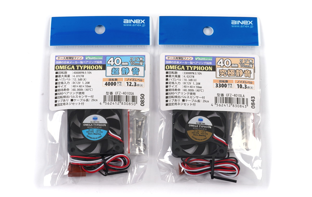AINEX OMEGA TYPHOONの40mmファンには超静音モデル(CFZ-4010SA)と究極静音モデル(CFZ-2010LA)の2種類がラインナップされています。