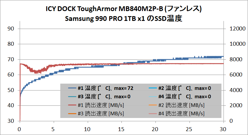 「ICY DOCK ToughArmor MB842MP-B」で増設した2台のSSDへ連続読み出しをかけ続けたところ、30分以上が経過するとSSD温度は2台のうち高温な方は90度に達するものの、サーマルスロットリングによる速度低下はありませんでした。