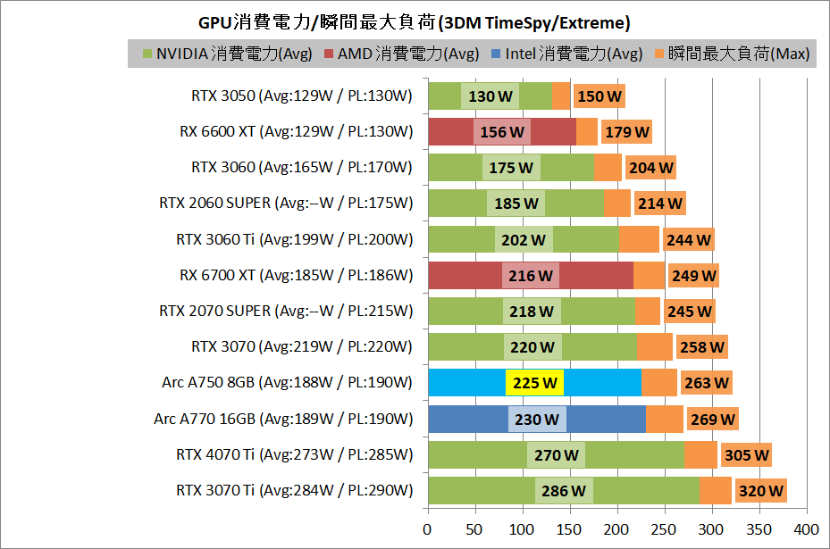 Intel Arc A750 8GB Limited Editionの消費電力は225W、最大瞬間負荷は263Wでした。Intel Arc A750 8GB Limited Editionの公式仕様においてTGPは225Wに設定されているので、それに準拠した消費電力になっています。
