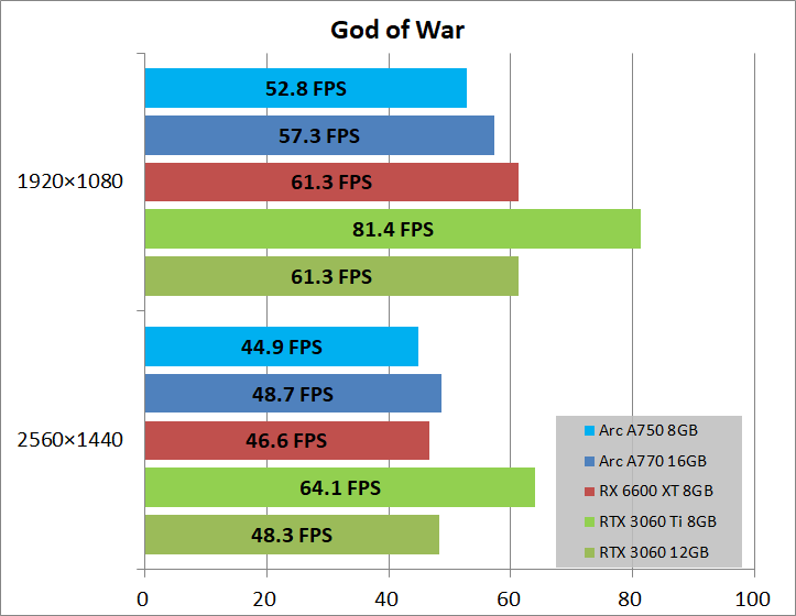 God of War(ウルトラ設定プリセット, モーションブラー:オフ)に関する「Intel Arc A750 8GB Limited Edition」を含めた各グラフィックボードのベンチマーク結果です。