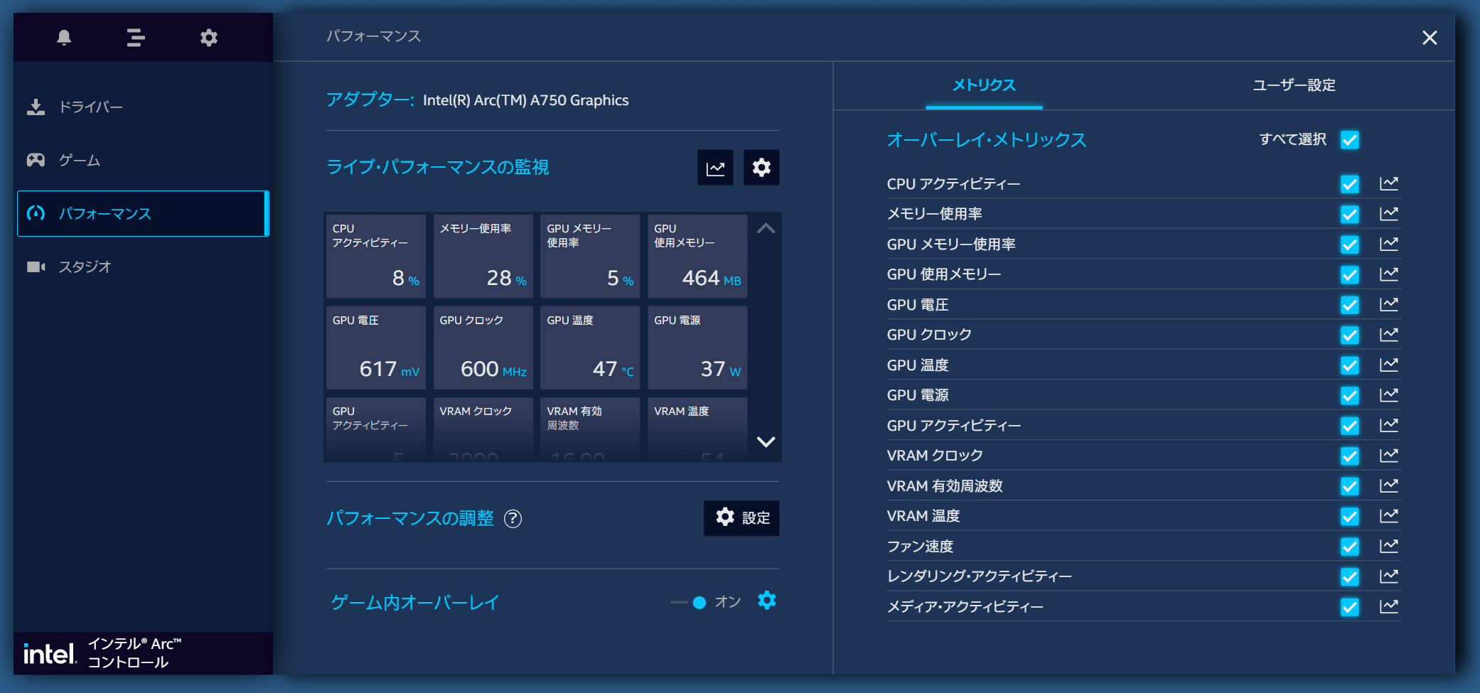 Intel公式ページで配布されている「Intel Arc A750 8GB Limited Edition」などに対応するArc GPU用ドライバには、GPU動作設定やゲーム画面の録画・配信が可能な専用コントロールソフトウェア Arc Controlが含まれています。