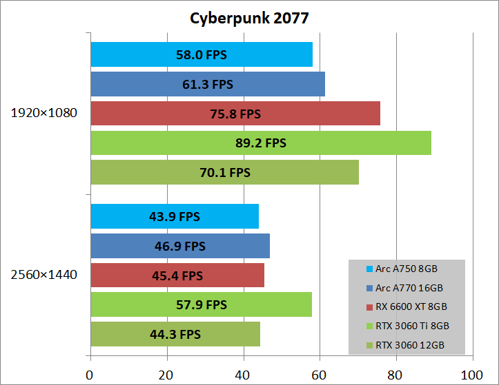 明らかに支障があるという程ではないものの、VRAM容量の使い方が悪く、同じ8GB容量のRTX 3060 Tiは問題ないのに、Arc A750 8GBはArc A770 16GBに対して性能を落とすケースもありました。
