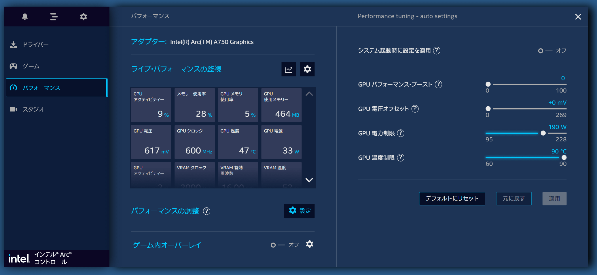 パフォーマンスタブではGPU温度などモニタリング情報のオーバーレイ、GPU動作設定の変更(オーバークロック)の設定が可能です。