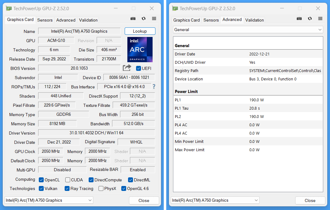 Intel Arc A750 8GB Limited Editionの検証機材・GPU概要