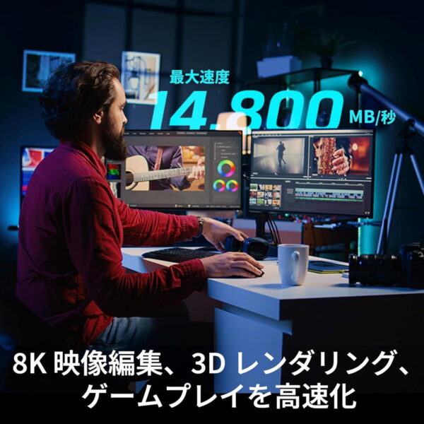 - 最大性能で連続読み出し14.8GB/s、連続書き込み14.0GB/s