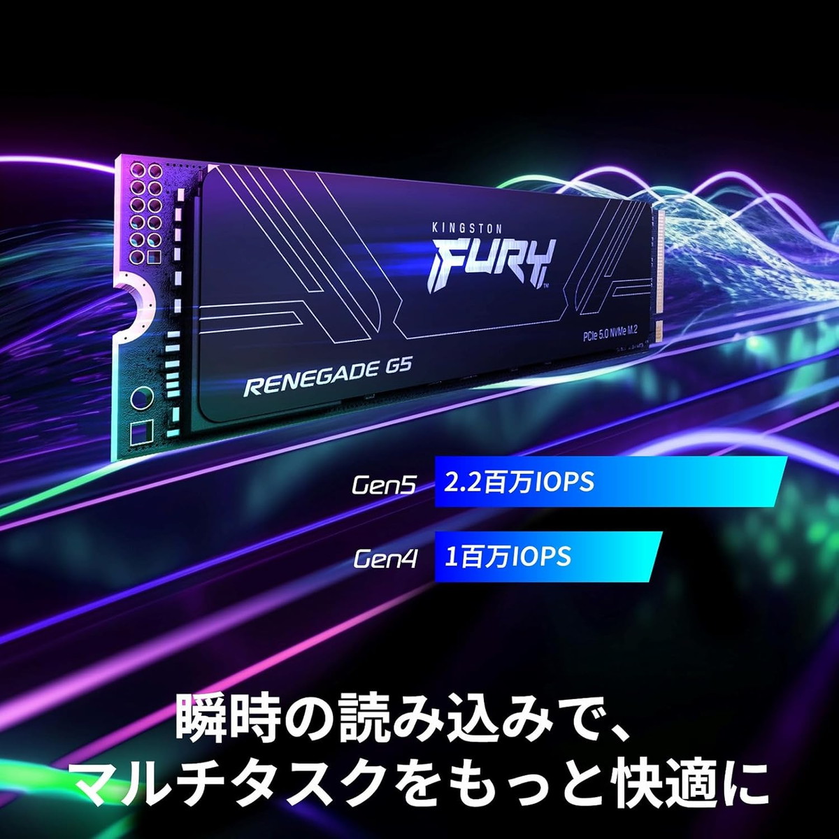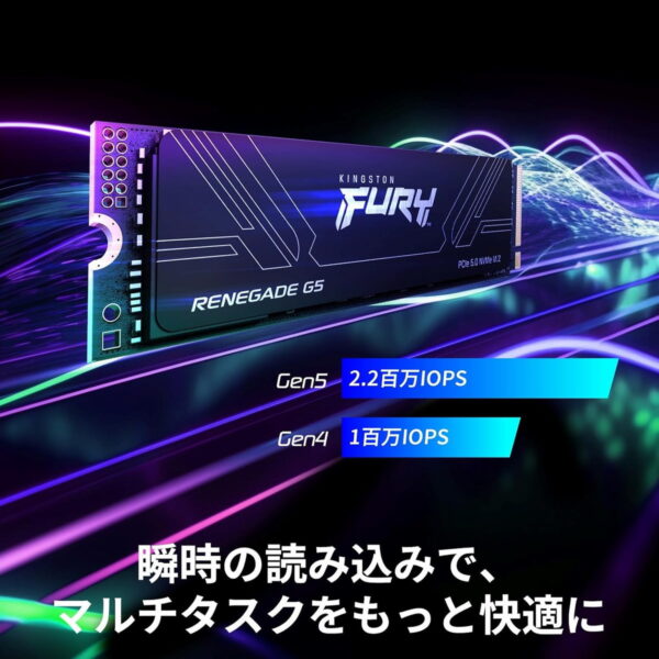 「Kingston FURY Renegade G5 SSD」のアクセススピードは容量によって若干異なりますが、最大でシーケンシャル読出 14,800MB/s、シーケンシャル書込 14,000MB/s、ランダム読出 2,200,000IOPS、ランダム書込 2,200,000IOPSの超高速アクセスを実現しています。