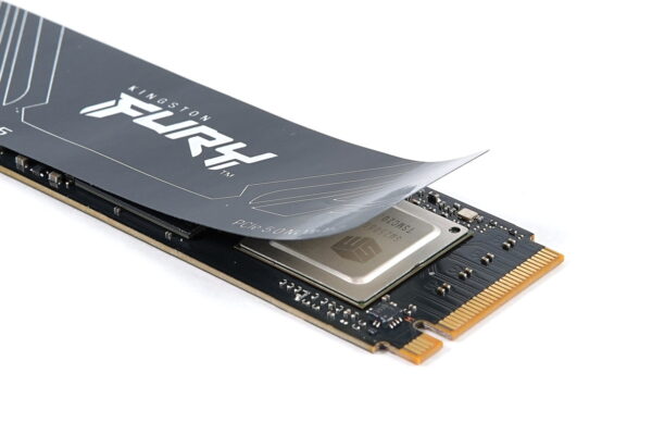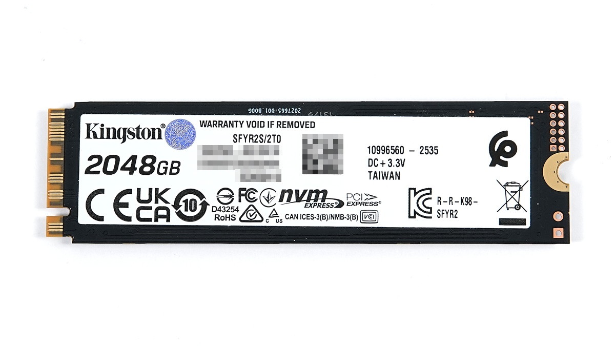 PCIE4.0対応SSDのKC3000は表面の製品ロゴシールが、サーマルパッドを介して社外製ヒートシンクを装着しても適切に放熱が可能な銅箔シールになっていましたが、「Kingston FURY Renegade G5 SSD」は消費電力が大幅に低減していることもあって、そういったギミックのない単純なロゴシールです。