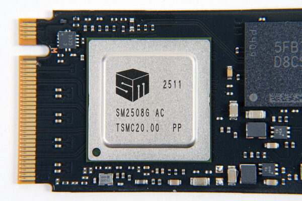 「Kingston FURY Renegade G5 SSD」のメモリコントローラーは公表されていませんが、実機を確認すると、TSMC 6nmプロセスで製造される8チャンネル、3600MT/sのメモリコントローラー Silicon Motion SM2508が採用されていました。