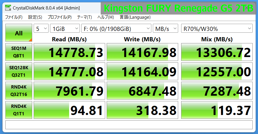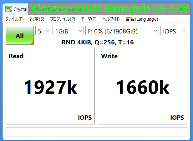 「Kingston FURY Renegade G5 SSD」は読み出し速度が6,100MB/s程度、書き込み速度が6,100MB/s程度でした。