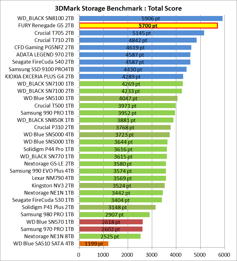 3DMark Storage Benchmarkのトータルスコアについて、「Kingston FURY Renegade G5 SSD 2TB」やその他ストレージを比較しました。