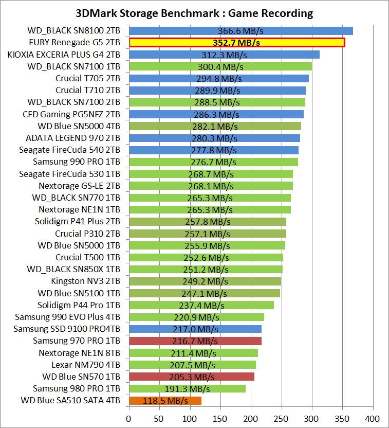 プレイ動画録画性能について、「Kingston FURY Renegade G5 SSD 2TB」やその他ストレージの比較は次のようになっています。