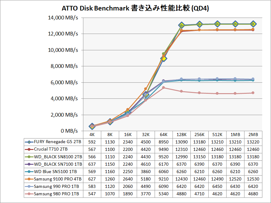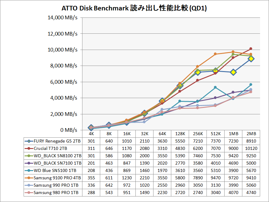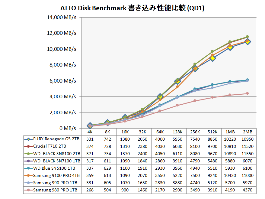 最新モデルに対してはSamsung 9100 PROやCrucial T710には勝ち越すものの、同じくBiCS8メモリを採用するWD_BLACK 8100には及ばず、最速には一歩届きません。とはいえ、現状では2番手につける高性能です。
