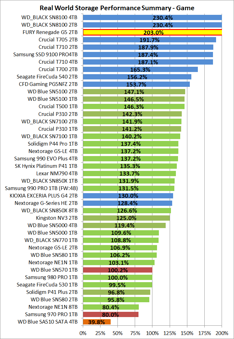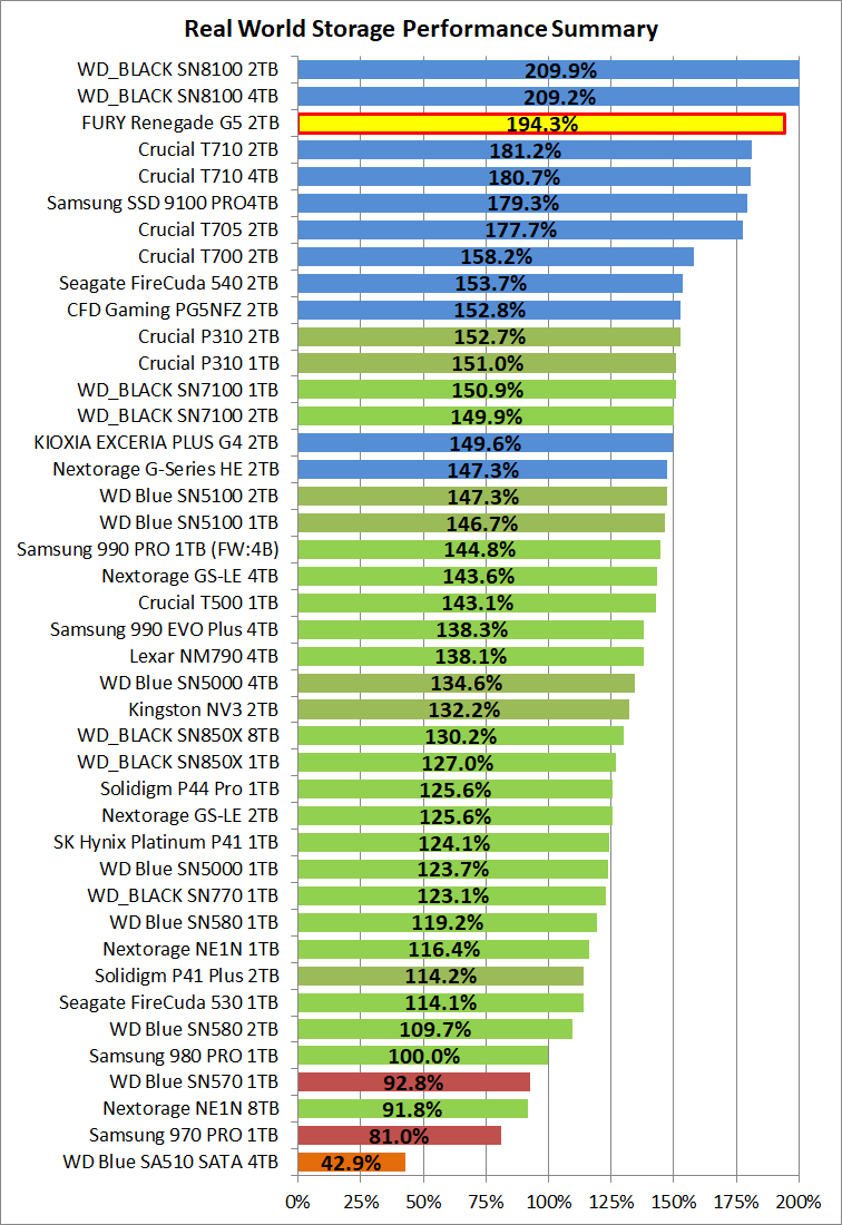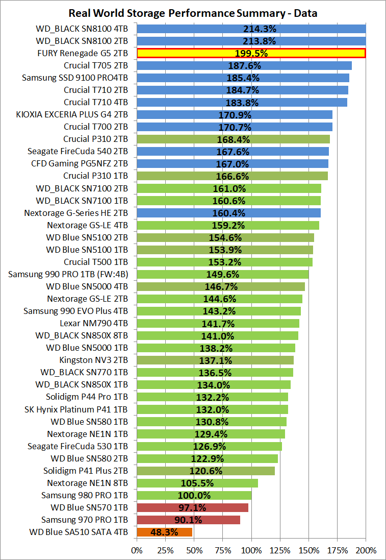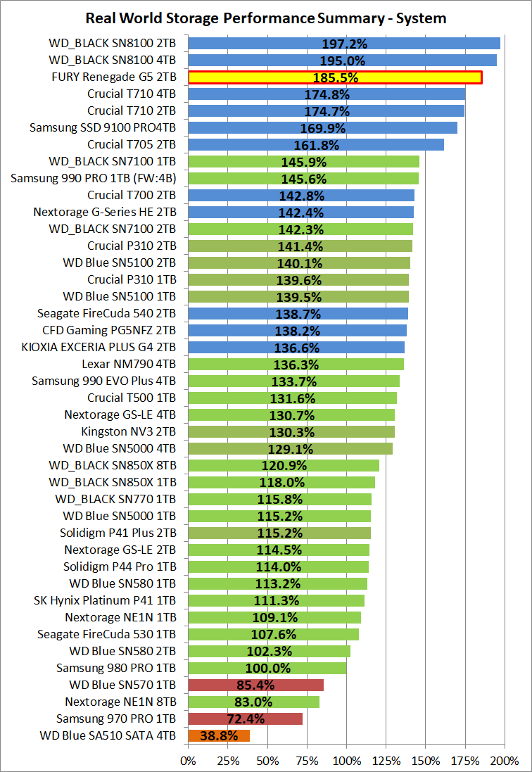 「Kingston FURY Renegade G5 SSD 2TB」など各種SSDに関して総合的なSSD実用性能の比較グラフ(パフォーマンスサマリー)を作成しました。