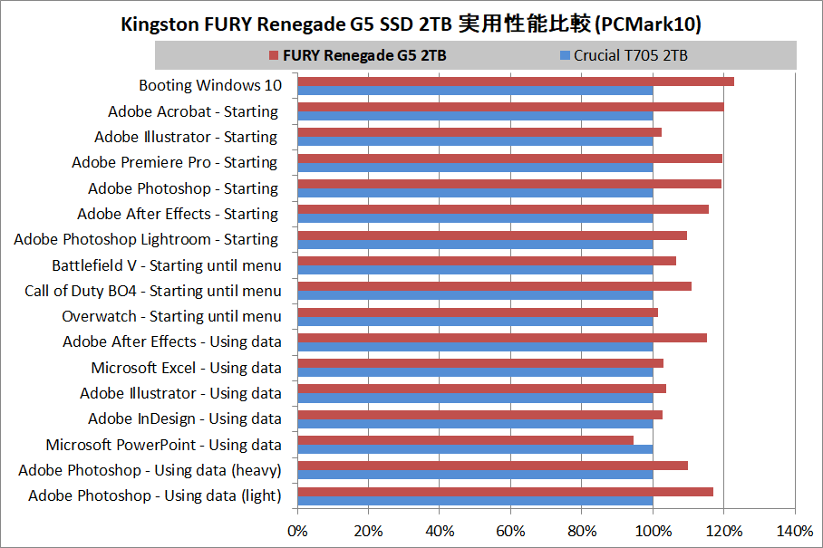 「Kingston FURY Renegade G5 SSD」はPCIE5.0対応SSDの初期製品では最速だったCrucial T705と比較して消費電力が40%~60%と大幅に低減していますが、PCMark10による実用性能ベンチでは個別Traceで比較してみてもほぼ全てで勝ち越しています。