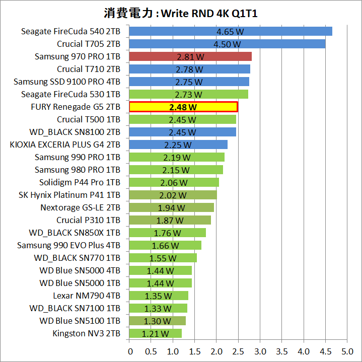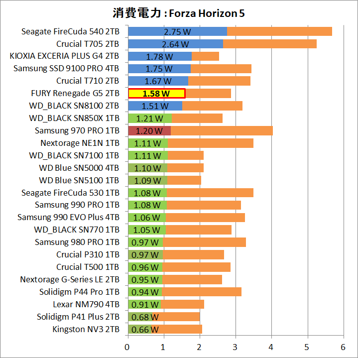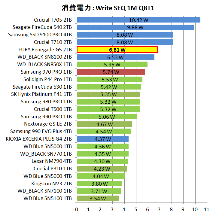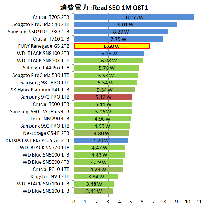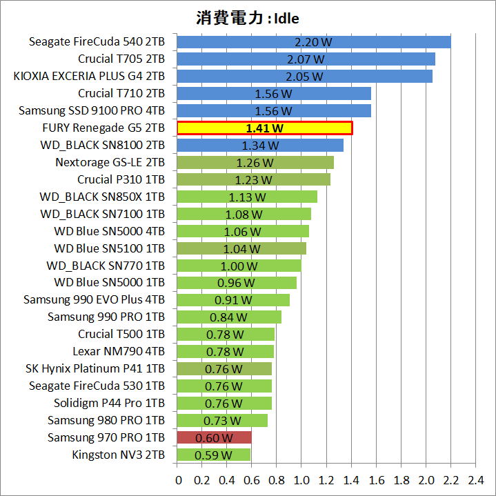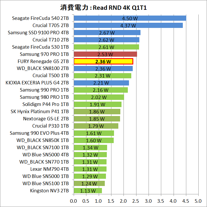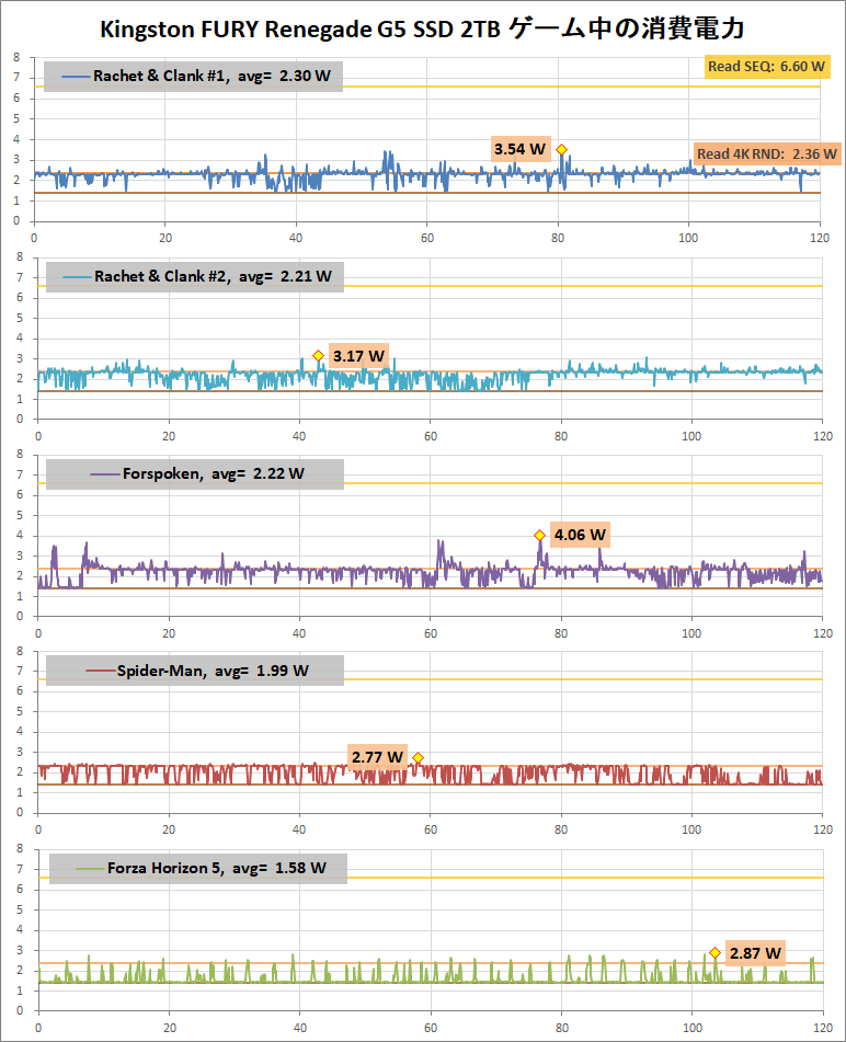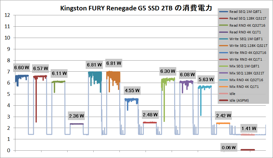 「Kingston FURY Renegade G5 SSD」は、PCIE5.0対応SSDとして理想的な14GB/sの連続読み書きでも消費電力は6W台に収まり、加えて、4Kランダムが2.5W程度、アイドルが1.4W程度に低減しています。