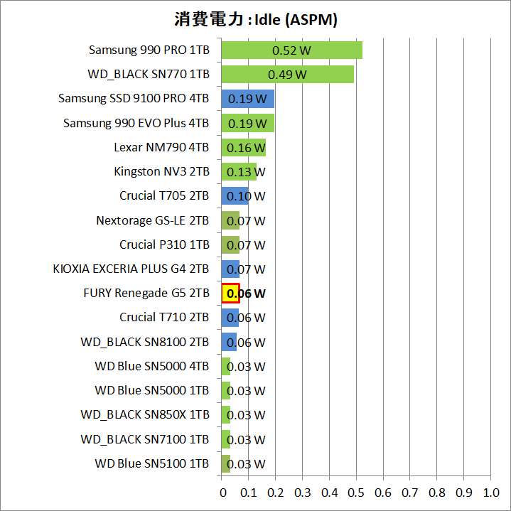 近年のPCIE4.0対応SSDと比較するとまだ消費電力は大きいですが、一般的な使い方で連続読み書きの負荷が1分も続くことはないので、4Kランダムとアイドルの消費電力がこれくらい低ければ、一般的なパッシブ式のMBヒートシンクでも十分に常用できると思います。