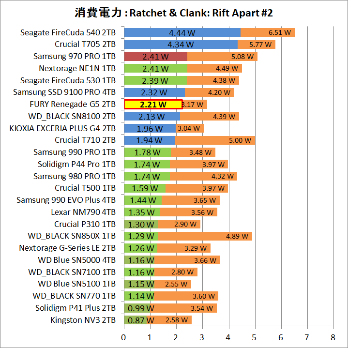 10GB/s超の連続読み書きで10W以上、4Kランダムで4W以上、アイドル状態で2W以上という、Crucial T705などPHISON PS5026-E26を採用する初期PCIE5.0対応SSDの消費電力の大きさは、アクティブ冷却が強く推奨される感じで導入ハードルを引き上げていました。