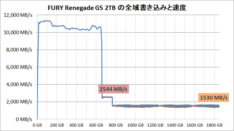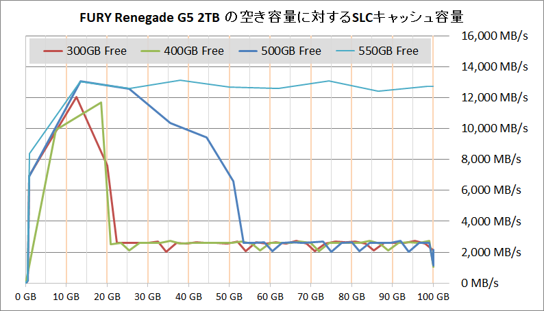 事前に空き容量が半分前後になるようにデータを書き込み、なおかつ使用済みSLCキャッシュが十分に開放された状態で測定を行っています。