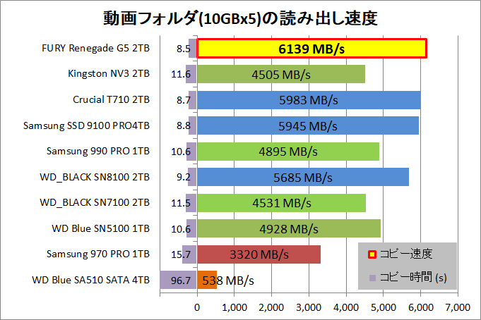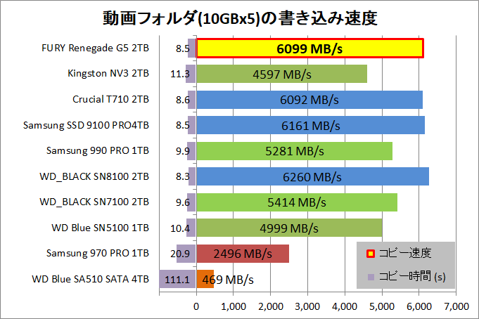 「Kingston FURY Renegade G5 SSD 2TB」で50GBの動画フォルダのコピー速度を検証しました。
