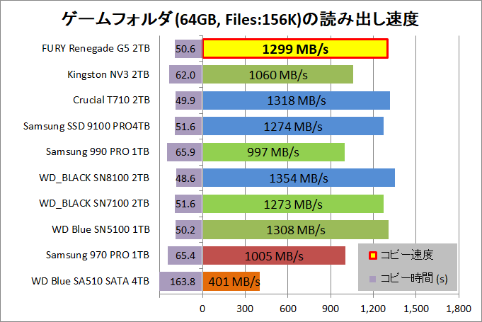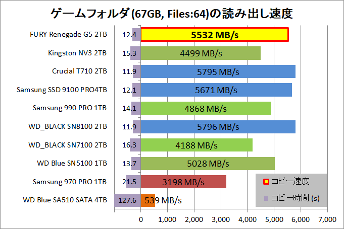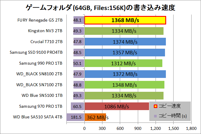 最後は先ほどと同じくゲームフォルダのコピーですが、こちらはゲームデータが大きいファイルにパッケージ化されておらず、15万を超えるファイル数があるので、ランダム性能が重要になります。