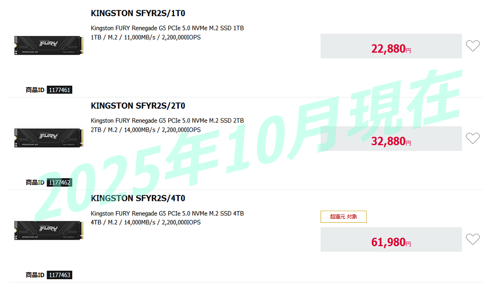 Kingston FURY Renegade G5 SSD スペック一覧 | |||