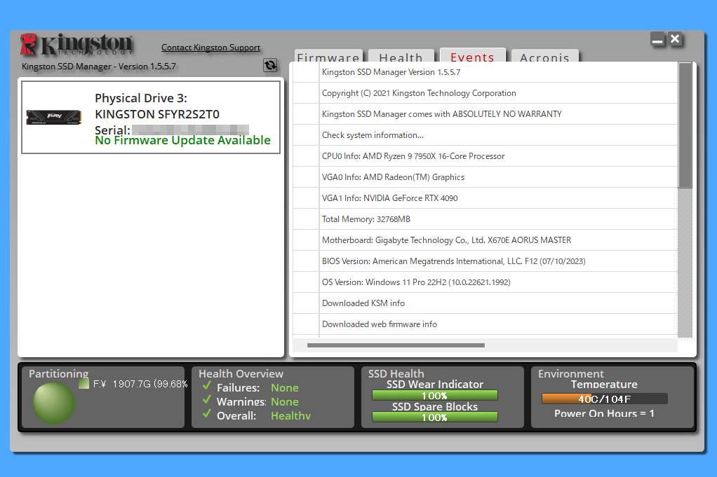 Ryzen 9 7950XとGIGABYTE X670E AORUS MASTERの検証環境で、レビューストレージはCPU直下のM.2スロットに、コピー相手のCrucial T700 2TBはPCIEスロットを挟んで1つ下のM.2スロットに設置しています。