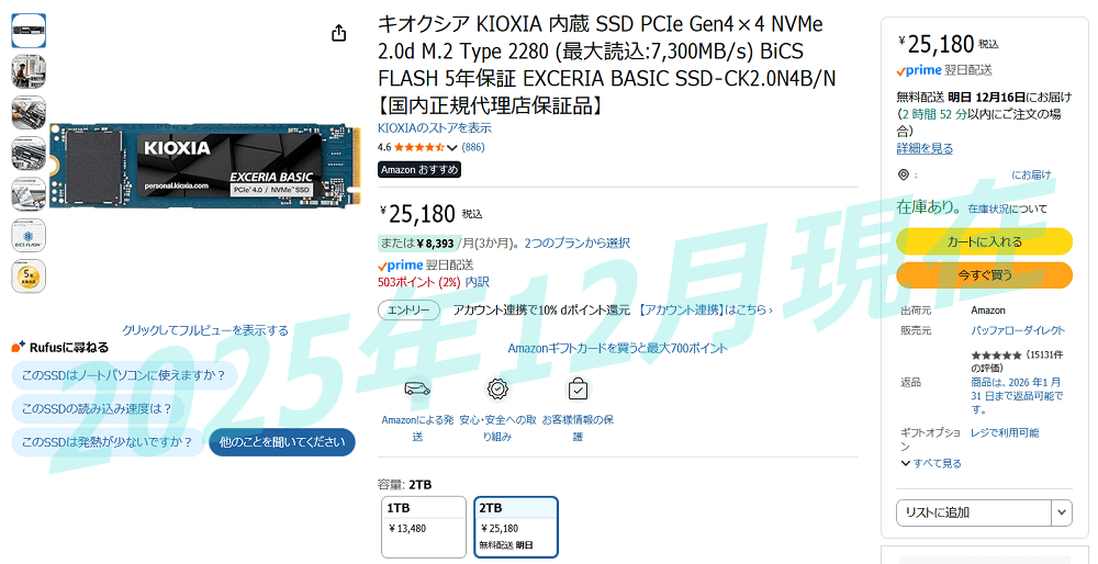 某社が一般向けSSD&メモリブランドを終了させたように2025年後半に入ってからSSDも価格高騰の傾向がありますが、2025年12月現在において、「KIOXIA EXCERIA BASIC NVMe SSD」は1TB当たり1.3万円程度という適正な容量単価で購入できるので、メーカーへの信頼性も相まって嬉しい製品です。