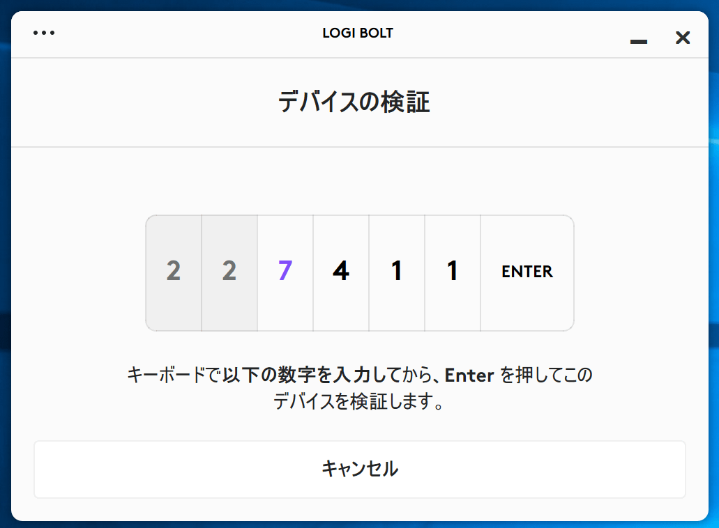 Unifyingの時は電源スイッチをオフの状態からオンにするだけでペアリングされましたが、Logi Boltではデバイス認証としてキー入力操作が追加されました。画面表示に従ってキー入力を行ってください。