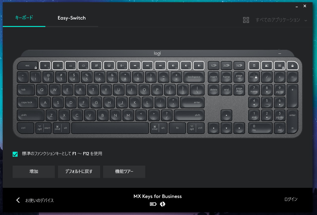 同じようにトップメニューからMX Keysのイメージアイコンを選択すると、ファンクションキー等の設定画面が表示されます。