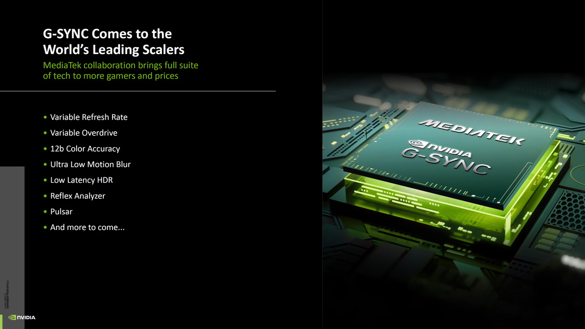 2024年11月現在、対応製品は未発売ですが、従来特殊なG-Syncモジュールの搭載が必要だったReflex AnalyzerやULMB(MBR機能)が、今後発売されるMediaTek製コントローラー採用の新モニタでは利用できるようになるとNVIDIAから発表されています。