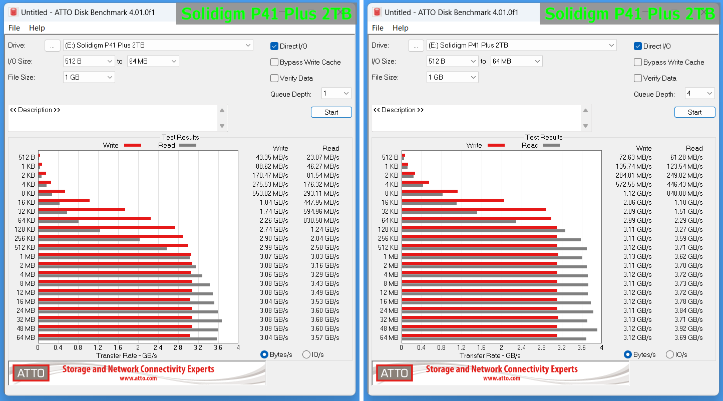 ATTO Disk Benchmark 4.00.0f2 (512B-64MB, 1GB, QD1/QD4)について、「Solidigm P41 Plus 2TB」やその他の比較対象ストレージのベンチマーク結果は次のようになっています。