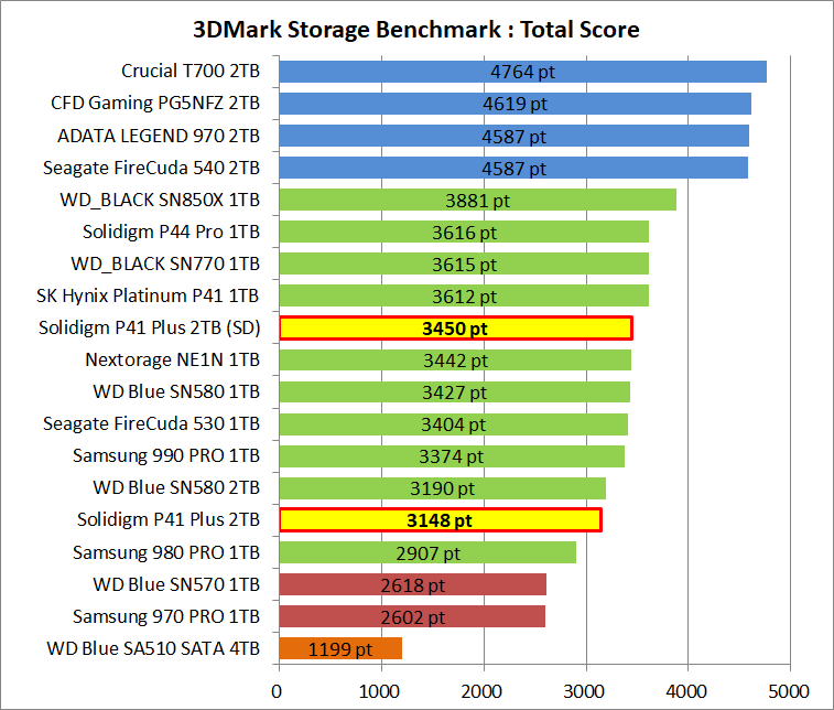 3DMark Storage Benchmarkのトータルスコアについて、「Solidigm P41 Plus 2TB」やその他ストレージの比較は次のようになっています。
