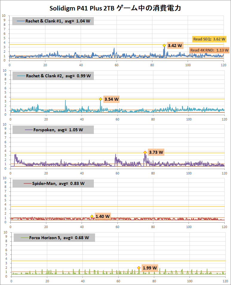 現状ではPCゲームプレイ中のSSD消費電力は、データの読み出しが多いタイトルでもCDMの4Kランダム読み出しと同程度、そうでなければアイドル状態をベースにして4Kランダム読み出し的な消費電力のアクセスがぽつぽつと発生する感じなので、製品別に見てもSSD消費電力の傾向はCDMの4Kランダム読み出しかアイドルに一致します。