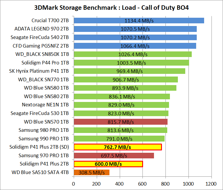 3DMark Storage BenchmarkのCall of Duty Black Ops 4 ゲームロード速度について、「Solidigm P41 Plus 2TB」やその他ストレージの比較は次のようになっています。