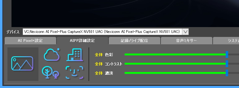 ちなみに、UVC対応ビデオキャプチャの仕様として映像データを出力できるアプリは1つに制限されるのですが、NV501/NV601で取得した映像をOBSに出力しつつ、NEXiCONNectorをAI Pixel-Plusのソフトウェア制御にだけ使用するという使い方は可能でした。