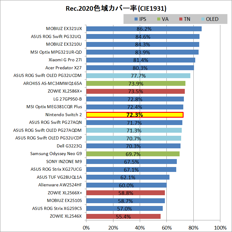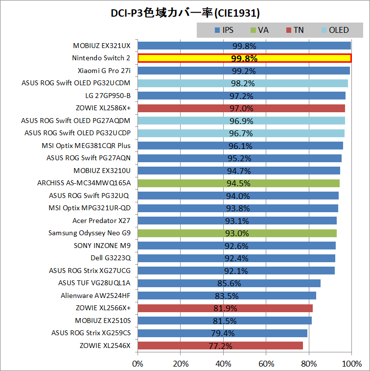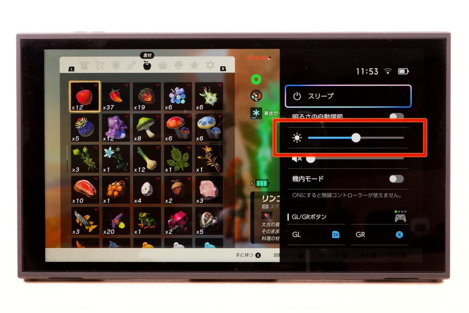 OLEDモデルの有機ELディスプレイと比較すると色域(高彩度の発色性能)は少し劣りますが、DCI-P3と呼ばれる広色域をカバーしていて初代Switchよりも鮮やかです。